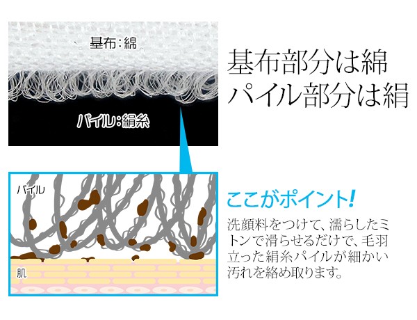 | 極細の絹糸パイルが、優しく毛穴汚れや古い角質を落とします。シルクミトン/シルクパイル/洗顔ミトン/洗顔グッズ/毛穴/角質 |