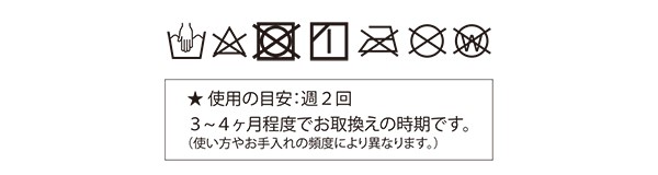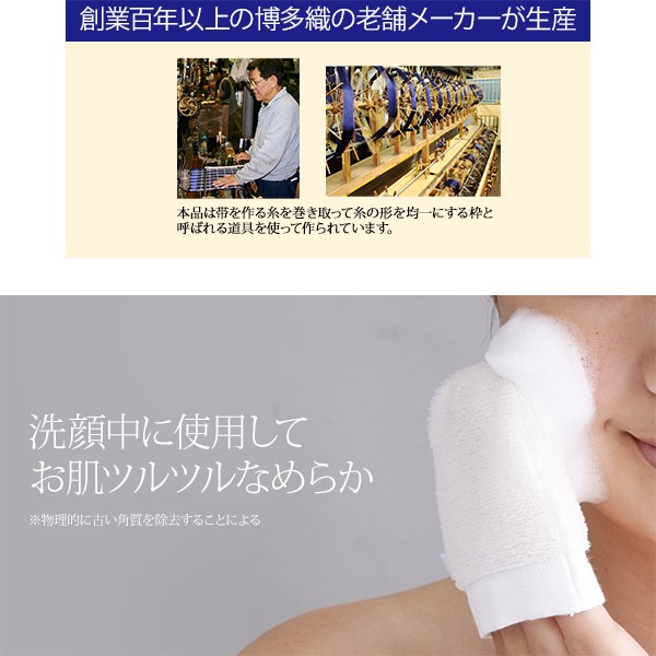 | <使用方法> (1)洗顔時、泡を洗い流す前に濡らしたミトンで、お顔の泡をふき取るように滑らせます。 (2)最後にお顔の泡をよくすすいでください。 (3)ミトンについた泡は、十分に洗って陰干ししてください。 <使用上の注意> ●こすりすぎにご注意ください。●使用中または使用後、お肌に異常を感じた時はただちに使用を中止してください。●お肌に合わない場合はご使用をお止め下さい。 ●お肌に異常のある場合はご使用をおやめください。●天然素材のため、使い方や使用頻度、お手入れの仕方により耐久性が異なります。●カビの原因になりますので、お風呂場などの湿気の多い場所には保管しないでください。●洗濯機ではネットに入れてご使用ください。●塩素系漂白在の使用はしないでください。●すじ線は織物独特のものです。 |