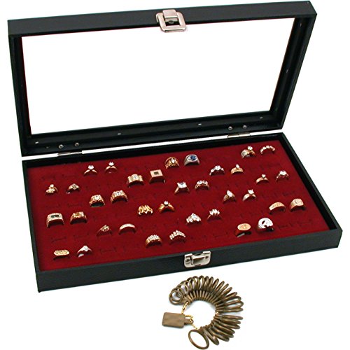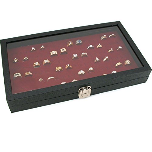-. Binding : Kitchen -. Brand : USJS -. Color : Red -. Feature : Key lock locking glass top case finished in black leatherette with velvet flock over foam 72 ring insert / The glass top case measures 14 3/4"W x 8 1/4"D x 2 1/8'h / The ring insert is burgundy velvet flocked over foam with 72 "I" shaped slots for rings / Includes 2 keys / Offered and sold exclusively from USJS -. IsAutographed : 0 -. PackageQuantity : 1 -. ProductGroup : Home -. ProductTypeName : HOME -. Title : Glass Top Lid 72 Ring Burgundy Jewelry Display Case Box