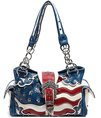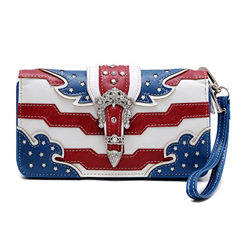American Flag Stars and Stripes Rhinestone Buckle Western Concealed Carry Purse Women Handbag Wallet Set
