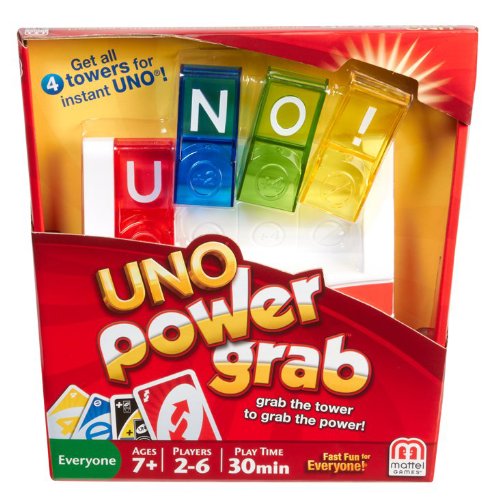 -. Binding : Toy -. Brand : Mattel -. EAN : 0746775200060 -. Feature : Get ready for a new twist to the classic game of UNO / Fast Fun for everyone with the added excitement of a power play / Power Towers can be used to block action cards or sabotage opponents / Collect all 4 Power Towers and get an instant UNO / Includes 112 UNO cards, 4 Power Towers and discard tray -. IsAdultProduct : 0 -. Label : Mattel -. Manufacturer : Mattel -. Model : Y2316 -. MPN : Y2316 -. NumberOfItems : 1 -. PackageQuantity : 1 -. PartNumber : Y2316 -. ProductGroup : Toy -. ProductTypeName : TOYS_AND_GAMES -. PublicationDate : 0100 -. Publisher : Mattel -. Studio : Mattel -. Title : UNO Power Grab Game -. UPC : 787551559118 -. Warranty : 1 year warranty against manufacturer defects