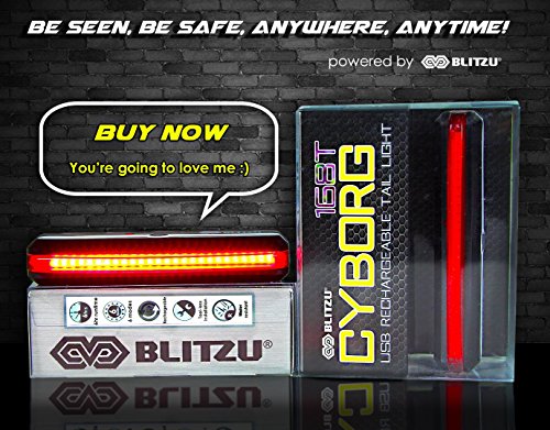 ✔ ORDER NOW WITH NO RISK - Buy from Blitzu for your 100% SATISFACTION GUARANTEE. We've got you covered! If you aren't happy with the Cyborg 168T rear bike light for ANY reason within 30 days of purchase, let us know and you get your money back! That's how confident we are that you will love it! This guarantee applies only to products purchased by the end-user from the manufacturer - Blitzu. Purchases made through other sellers are not warranted by the manufacturer.