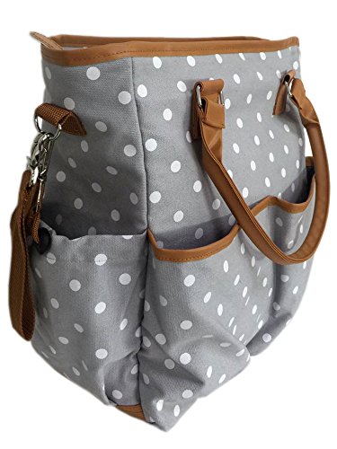Our polka dot bag is currently available in gray with white polka dots and tan leather trim. The durable cotton canvas is easy to spot clean and the interior is polyester, which makes messes easy to wipe away.