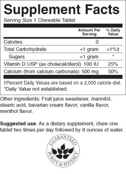 Calcium never tasted so good! Great for people who have trouble swallowing pills, this special bone-nourishing formula combines 500 mg of calcium (from calcium carbonate) and 100 IU of vitamin D in delicious, vanilla cream-flavored chewable tablets with only three calories per serving.Feature