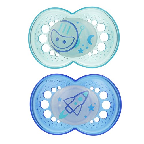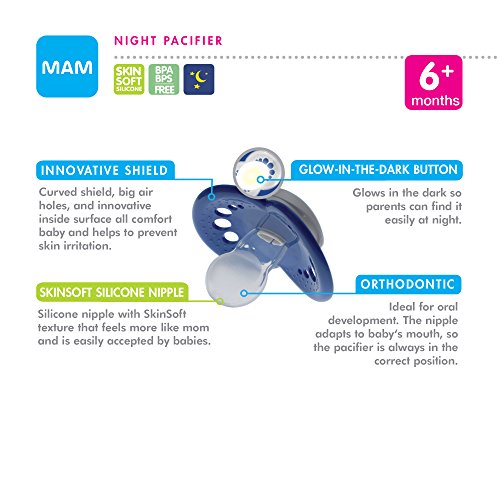 -. Binding : Baby Product -. Brand : MAM -. Color : Boy -. Department : baby-boys -. EAN : 0721867161856 -. Feature : Designed for sensitive skin, the open shield provides extra air flow / Symmetrical orthodontic nipple is ideal for baby's jaw and teeth development / Silicone SkinSoft nipple with a silky texture that feels more like mom is easily accepted by babies / Textured surface and multiple small openings on the pacifier shield allow air to circulate and baby's skin to breathe / Easy hold button makes it easy to grab and attach to a pacifier clip -. IsAdultProduct : 0 -. Label : MAM -. Manufacturer : MAM -. Model : 2154-012-0-1 -. MPN : MAM-194 -. NumberOfItems : 1 -. PackageQuantity : 1 -. PartNumber : MAM-194 -. ProductGroup : Baby Product -. ProductTypeName : BABY_PRODUCT -. Publisher : MAM -. ReleaseDate : 2013-06-04 -. Size : 6 Plus Months -. Studio : MAM -. Title : MAM Glow in the Dark Night Orthodontic Pacifier, Boy, 6+ Months, 2-Count -. UPC : 845296021540