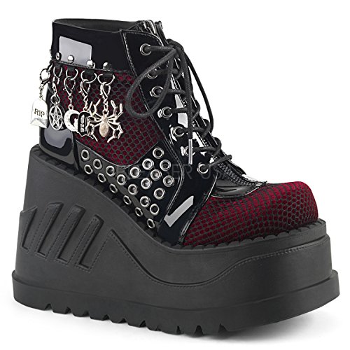 Binding : Apparel Product Description STOMP-18/BVL-BYVEL features 4 3/4" (121mm) Platform Lace-Up Front Wedge Bootie Featuring Fishnet Overlay on Vamp, Eyelets on Outer Side Panel, Non-Functioning Zipper Detail on Tongue, and D-Rings w/ Various Dangling Charms, Inside Metal Zip Closure 0
