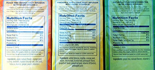 -. Feature : Naturally flavored with added vitamins / Lively and refreshing / Serve hot, or s a delightfully diffrent iced tea / Convenient 3 flavor sampler - 1 box of each (20 tea bags per box) / This item is not a manufacturer-created variety pack and will not be sent in the original manufacturer's packaging