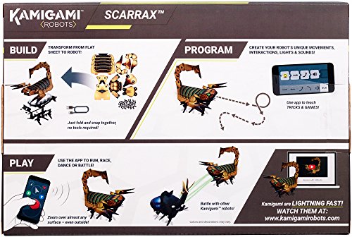 Kamigami is a build-it-yourself robot platform using foldable plastic material! Designed after nature's fastest critters, they magically fold up from a flat sheet & zoom over almost any terrain, even outside. Download the free app from your favorite app store to drive your Kamigami, battle with friends, play interactive games, or, best of all, design and program your robot's reactions, games and movements. The visual programming interface makes it easy to blink lights, play sounds and maneuver around obstacles. The app will continually offer new updates and game suggestions, so there's no room to get bored. Kamigami are light as a feather and quick as a bug!Feature