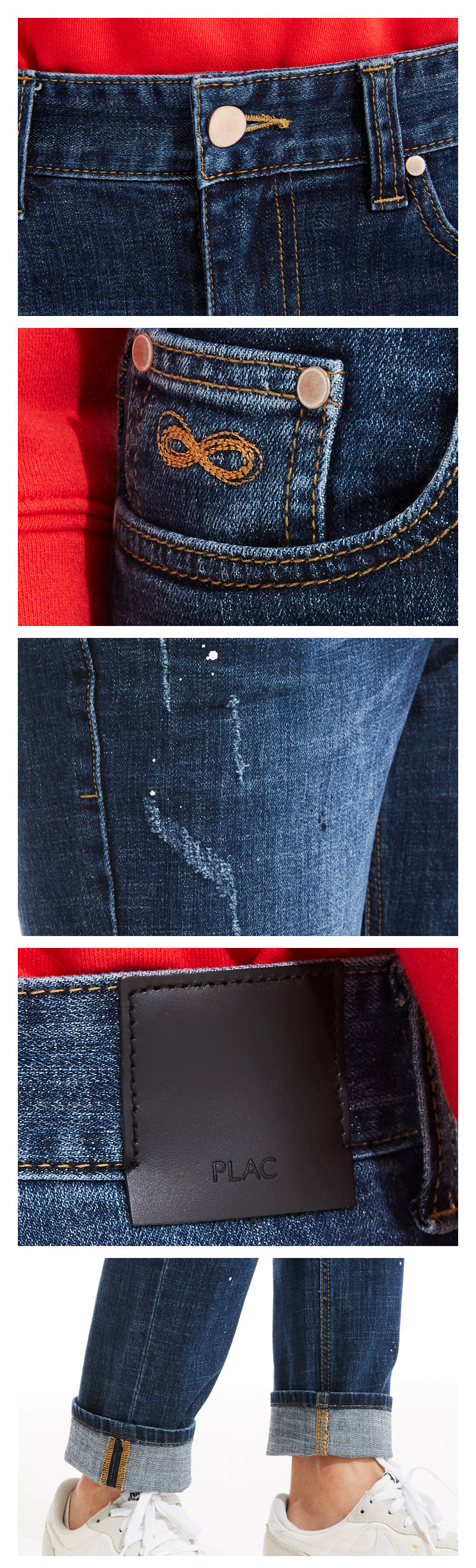 - 탄성이 있으며 가벼운 경량 원단 - 페이딩 되어 올라오는 슬랍이 남성스러움을 더해줌 - 무게감이 느껴지는 미드 인디고 컬러 - 일자형 튜브렉과 긴 밑위가 특징인 기본 슬림 스트레이트 핏으로 허리부터 밑단까지 전체적으로 슬림하게 감기는 실루엣 - 은은한 캣브러쉬에 엠보싱이 들어가 입체감이 느껴짐 - 러프한 비트구제와 페인팅이 남성스러움 - PLAC의 모던한 아이덴티티를 보여주는 가죽라벨이 포인트 - 살짝 내려입었을 때 스타일리쉬하며, 저스트로 착용하면 스탠다드한 핏 1SIZE UP! | |