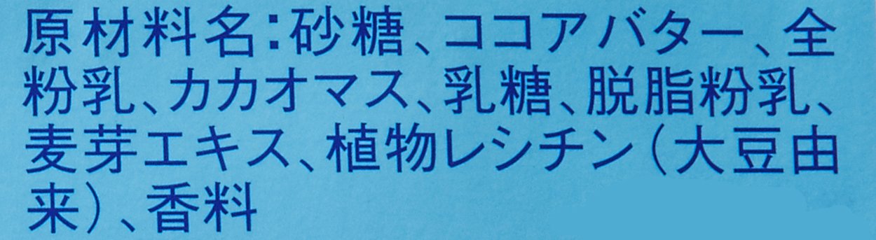 原材料:砂糖(スイス)、ココアバター(西アフリカ・中南米)、全粉乳(スイス)