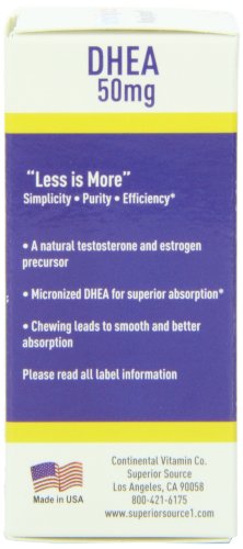 -. Binding : Health and Beauty -. Brand : Superior Source -. EAN : 0076635906352 -. Feature : Rhea also promotes bone strength / Rhea is an excellent choice for supplementing this important hormone / Dissolve one micro lingual tablet under the tongue directed by your healthcare provider / This product may also be chewed -. IsAdultProduct : 0 -. Label : Superior Source -. LegalDisclaimer : Cannot be shipped to California residents -. Manufacturer : Superior Source -. MPN : B003B1KJ0G -. NumberOfItems : 1 -. PackageQuantity : 1 -. PartNumber : B003B1KJ0G -. ProductGroup : Health and Beauty -. ProductTypeName : HEALTH_PERSONAL_CARE -. PublicationDate : 2013-03-30 -. Publisher : Superior Source -. ReleaseDate : 2013-04-09 -. Size : 100 -. Studio : Superior Source -. Title : Superior Source DHEA Multivitamin, 50 mg, 100 Count -. UPC : 076635906352