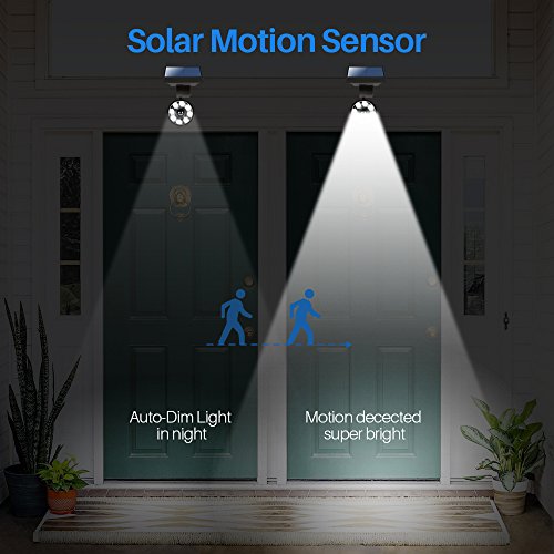Solar lights outdoor garden motion sensor light is apply to outdoor flood security lighting and surveillance security camera auxiliary lighting. If you want environment-friendly, versatile and powerful outdoor lighting for your Path,Porch,Deck, or a handy and quickly installed lamp for social occasions on your lawn and garden or by the pool, then our 1400Lm bright LED solar lights is an excellent option. Its advanced solar panel is designed for the most efficient use of solar energy, On sunny days only takes about 6-8 hours to fully charge,at least 30 hours of continuous use. The lamp holder is adjustable of 360 degrees, can meet a variety of angles of outdoor lighting.The weak light will be turned on automatically in the dark, then it will offer high light when people get close around 10-26ft..High-quality texture with aluminum-alloy case,more safely protection circuit of Li-ion battery,waterproof, explosion-proof,Ingress protection IP66.