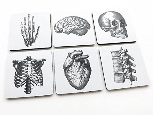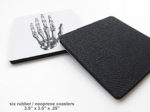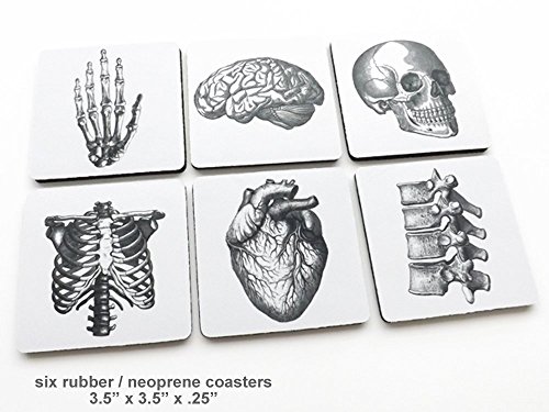 Anatomy coasters *** rubber / neoprene with a fabric top, 3.5" x 3.5" x .25" thick square *** set of 6 as pictured, gift box included *** hand vertebrae spine ribcage *** Fun party favors, stocking stuffers, hostess, office or housewarming gift, doctor, nurse, medical student graduation *** flexible mousepad material