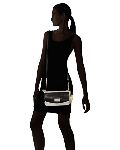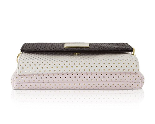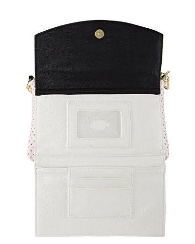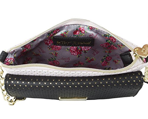 For the perfect blend of fashion and function, get the stylish Betsey Johnson wallet on string. Its constructed of all soft faux leather perforated exterior, featuring Top zipper pocket, snap front flap pocket with 2 bill, 3 credit card and id window, adjustable removable cross-body strap offers security while wearing.