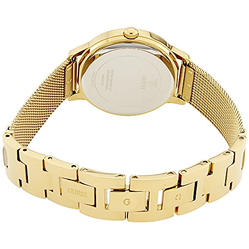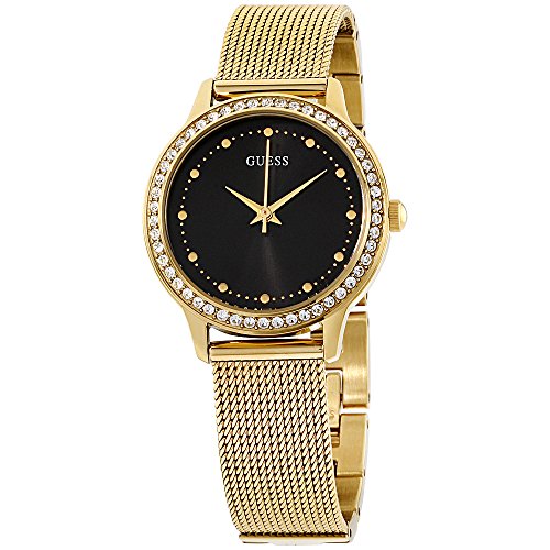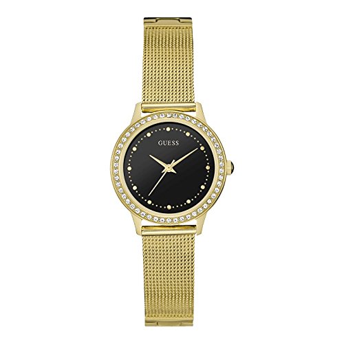 Guess Chelsea women's watch. Stainless steel strap and case in gold with bright embellishments on the bezel and on the black dial. Quartz movement.