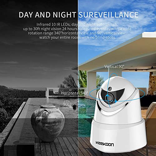 -. Feature : Full HD 1080P Video: KEEKOON full HD home camera with 1920*1080P resolution. Support Recording and Playback via local microSD Card(maximum 64G SD card) / Reliable2.4G WiFi Connection: Quick WiFi setup via mobile App "KEEKOON" on iPhone or Android smartphone. Wireless security camera supports remote access via mobile App anywhere and anytime. / Two-Way Audio&Night Vision: Responsive and advanced built-in mic&speakers with an anti-noise filter inside. Remotely talk and listen via mobile App even in the dark with the IR LED night vision up to 26.25 feet. / Motion Detection & Activity Alerts: Receive real-time Activity Alerts while you're out. instantly motion tracking records and centers the moving object. KeeKoon's safety hallmark Motion Detection/Tracking Algorithm accurately identifies, tracks, and records movement to help you keep an eye on everything! / Wider Vision:90°wide-angle advanced glass lens combined with 340°horizontal & 90° vertical rotation range creates a complete 360°coverage.