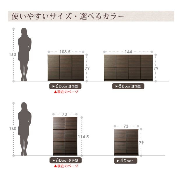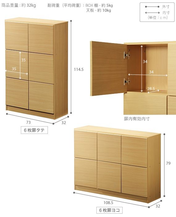 サイズ(cm):〔タテ型2x3〕幅73x奥行32x高さ114.5cm・約32kg、〔ヨコ型3x2〕幅108.5x奥行32x高さ79cm・約32kg
