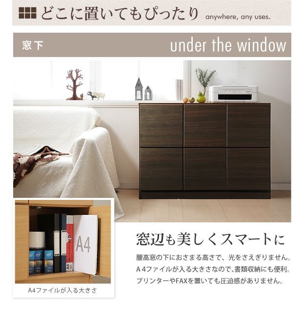 無駄のないシンプルなデザインのキャビネット。フラットな扉は、押すと開くプッシュラッチ式。木目の美しさが際立ちます。薄型なので玄関やカウンター下などでも邪魔にならず、用途や置く場所にとらわれません。扉内はA4ファイルが入るサイズなので書類収納もOKです。通気穴2か所付。