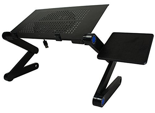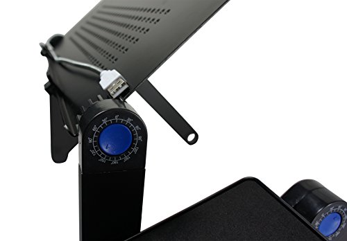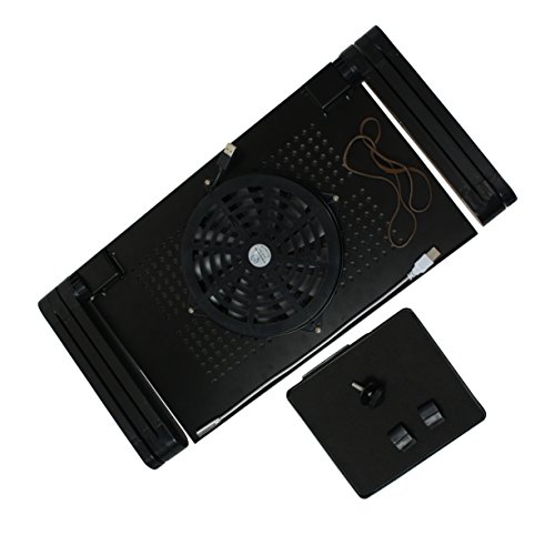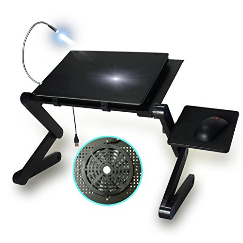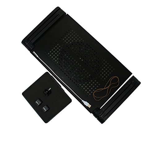 -. Feature : FULLY ADJUSTABLE LEGS - Rotate 360 Degrees and Lock in Place at Various Angles. Quickly Collapse The Stand to Make it Portable / For Laptop within 15", LED Light-Soft light to protect your eyes / MULTIPLE USES - Table Can Also Be Used For a TV Dinner Tray, Sound Equipment, Projector, Standing Desk, Book Tray, Writing Desk, and Tablet Holder / SILENT USB POWERED CPU COOLING FANS - Connect USB Cord (Included) to Your Computer to Power The Quiet Cooling Fans / LIGHT WEIGHT, HIGH STRENGTH ALUMINUM TRAY, STURDY LEGS - Makes Carrying Easy and Holds Your Computer Firm and Steady.
