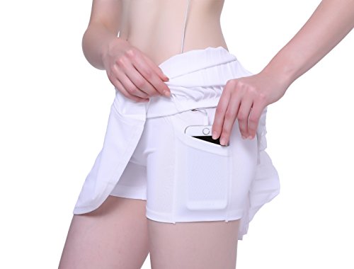 -. Feature : Please read our size details clearly before making the buying decision. / Two pockets on the sides of short and one earphone cable hole on the left side that it's convenient to answer the phone or listen to music when doing sports. / There is short iner and skirt outer, it's perfect for tennis, running, golf, hiking, and other sports. / Behind the skirt is pleated, the front is flat, fashionable and the style is novel. / Elastic-waist with drawstring, it is adjustable and fits well.