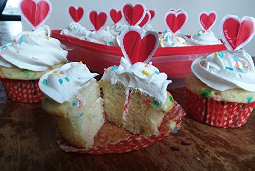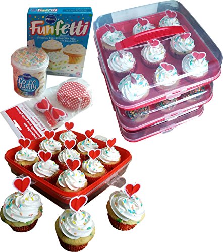 Valentine's Day Cupcake Liners Toppers with Carriers Bundle of 6 Items - Funfetti Cake Mix, Frosting, Heart Liners and Picks, 3 Carriers Great Party Idea