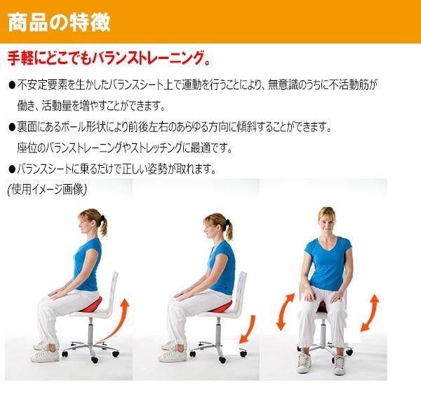 不安定要素を生かしたバランスシート上で運動を行うことにより、無意識のうちに不活動筋が働き、活動量を増やすことができます。裏面にあるボール形状により前後左右のあらゆる方向に傾斜することができ、座位のバランストレーニングやストレッチに最適です。