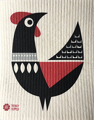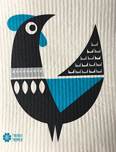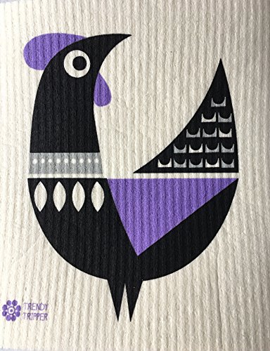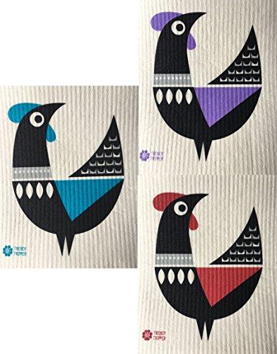 Swedish Dishcloths, Set of 3 Different Colored MODERN ROOSTER: 1 each TURQUOISE + PURPLE + RED