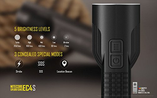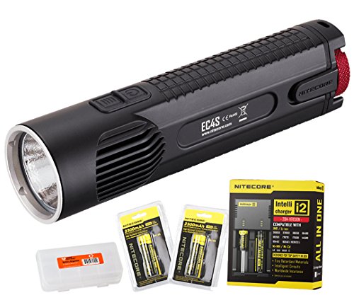 -. Feature : Include EC4S, two Nitecore 18650 batteries, i2 charger and LumenTac Battery Organizer / Maximum 2150 Lumens provides 306 yards visibility leveraging super efficient Cree CREE XHP50 LED / Easy to use dual button side switch to toggle among five brightness levels strobe and SOS / Support 4x CR123A or 2x 18650 batteries (included) / Unique die-cast manufacture optimzes heat dissipation, durability and waterproof