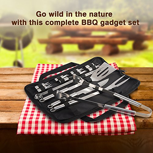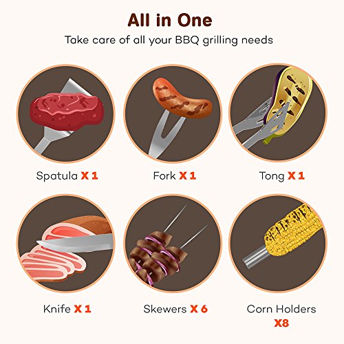 Lightweight and Portable Package Want to achieve a perfectly equipped grill for that garden party, beach carnival, or any gatherings, but worry about the hassle of carrying all the accessories? The included moist- and waterproof storage bag is the solution. Simply slide each utensil into its dedicated slot and you're good to go.