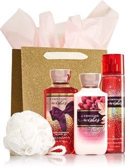 -. Binding : Misc. -. Brand : Bath & Body Works -. EAN : 0667594293555 -. Feature : Ready for you to wrap! This ultra pampering gift includes our super-lathering Shower Gel (10 fl oz), hydrating Body Lotion (8 fl oz), skin-loving Fine Fragrance Mist (8 fl oz) and a luxurious sponge. Fragrances arrive with a stylish gift bag & tissue so you can wrap and give with love! / Warm your heart a thousand times over with a festive blend of sparkling champagne, crystal peonies & almond crème -. IsAdultProduct : 0 -. MPN : B0186AXFDO -. NumberOfItems : 4 -. PackageQuantity : 1 -. PartNumber : B0186AXFDO -. ProductGroup : Beauty -. ProductTypeName : BEAUTY -. Title : Bath & Body Works A THOUSAND WISHES The Daily Trio Gift Set Full Size - Body Lotion - Shower Gel and Fragrance Mist -. UPC : 667594293555