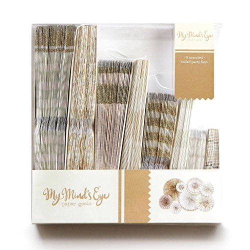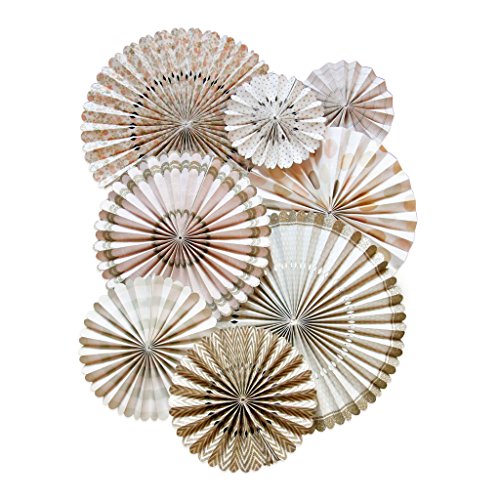 Delight your party guests with these decorative paper fans in peach, gray, white, and gold glitter. Comes in an assortment of pre-folded sizes and designs like polka dots, stripes, floral and triangles on a vintage newspaper background. Each fan has a loop to hang and comes with paper clips making them easy to assemble and hang for indoor and outdoor use at weddings, birthdays, and other events. Includes 8 assorted Vintage style paper fans.