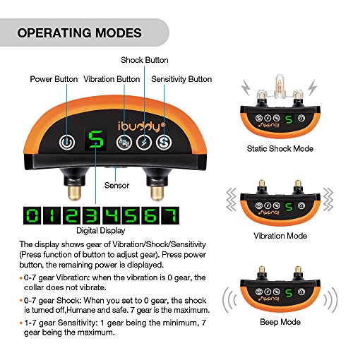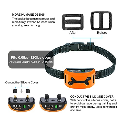 LED Display--The screen show the level of electricity,vibration,sensitivity,shock,you can easy to switch the mode and adjust the level. Adjustable Mode--Ranking from 0-7 you can choose to adjust the vibration and shock,"0"is?turn off the mode,"7" is the maximum.1-7 level adjustable sensitivity. Conductive Silicone Sleeve--Better to avoid damage during training and wear more comfortable. Power Display--Press "Power Button", the remaining power is displayed. Build-in Rechargeable Battery--When this no bark collar is fully charged, the screen will display "7". The charge time takes around 1 hour, full power can be used for 14 days. Charging the product with an adapter exceeding 1A is not allowed. Safety Shut Off Setting--The bark collar keep activates for 7 times in one minute, it will shut off, a minute then it will come into operation.