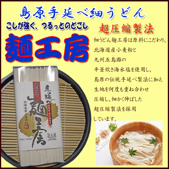 原料にこだわった小麦粉・塩を使い、超圧縮製法で作りました。ツルツル・シコシコの干し麺は、やみつきになるうまさです。五島うどんにも似たツルツル食感。わかめたっぷり冷やしうどんなど、是非一度お試しください^^。