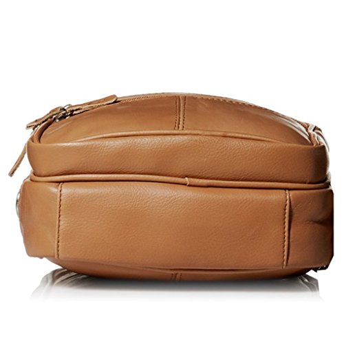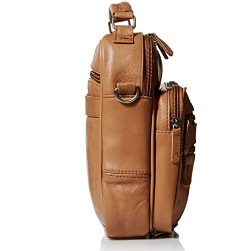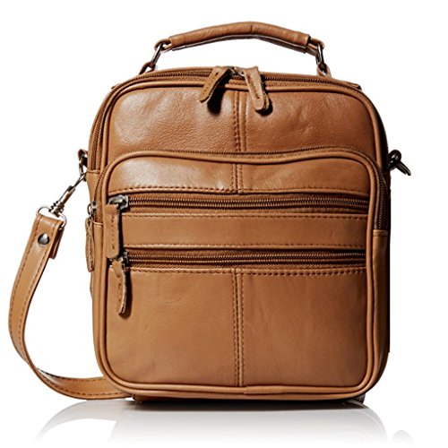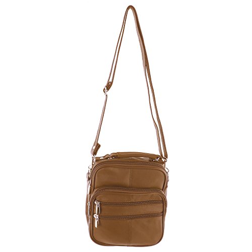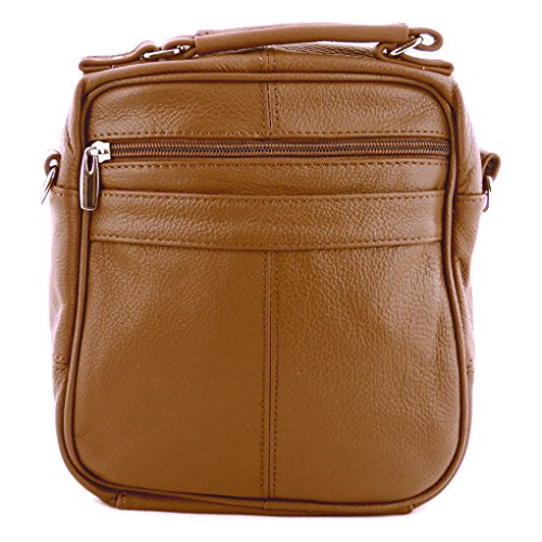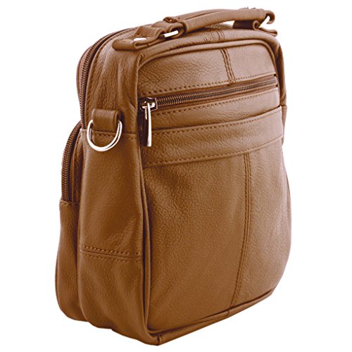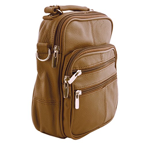 Mini travel / handbag with six zippered pockets: three in front, one to main compartment (one inside it), one on back (also has a Velcro pocket).Side has a cell phone holder. One adjustable strap included. Size in inches: 8 x 5. Material: Cowhide LeatherFeature