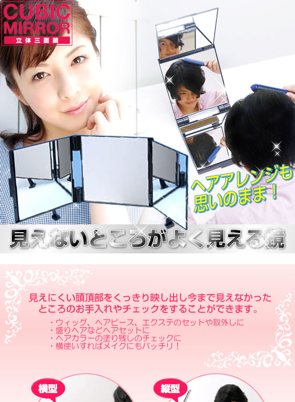 見えにくい頭頂部をくっきり映し出し、今まで見えなかったところのお手入れやチェックができます。今まで見えにくくて難しかったヘアアレンジやヘアカラーも自分でキレイに出来ちゃう♪サイズ/本体:高さ2×横23×奥行34cm ※サプライヤー直送品 ご注文後3~4営業日後の出荷となります【商品名】キュービックミラー 立体三面鏡