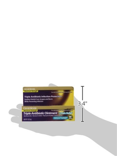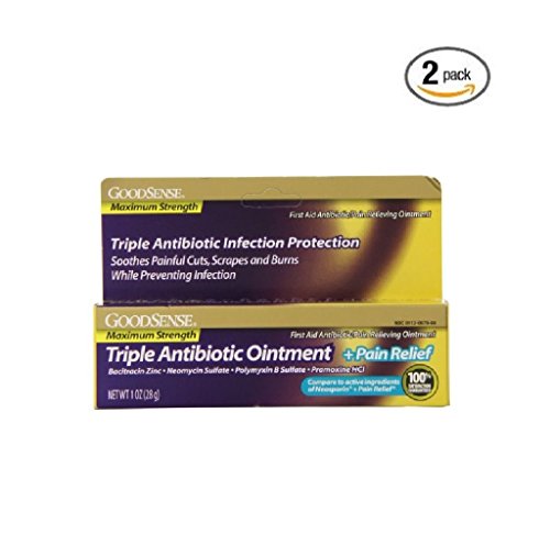 Good Sense Maximum Strength Triple Antibiotic Ointment + Pain Relief, first aid to help prevent infection and for temporary relief of pain or discomfort in minor: cuts, scrapes, burns. Compare to the active ingredients of Neosporin. This product is not affiliated with, manufactured by, or produced by the makers of Neosporin. See product images above for full product information.