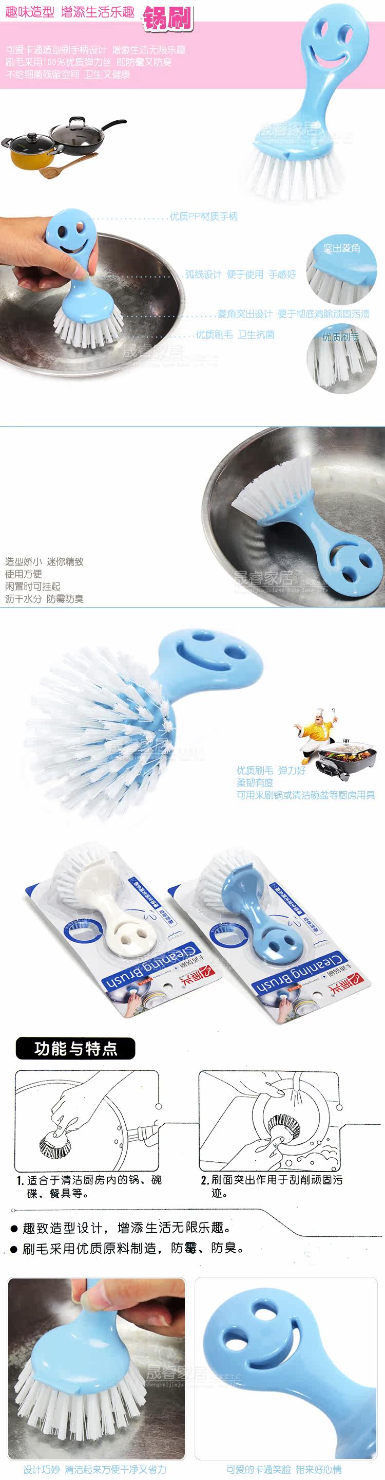 The bristles are made ??of 100% product quality raw materials manufacturing? mold? odor? cute cartoon brush handle design? add your spice of life? is suitable for cleaning the kitchen pots? dishes? cutlery? etc.? brush surface protrusions for scraping stubborn dirt plot. Clean utensils good helper Oh!
