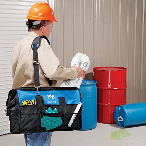 -. Feature : Vinyl-coated canvas tote bag withstands tough environments; pockets store additional tools and supplies / Pig skimmer socks stop spreading spills; Pig stat-mat pads and pillows absorb; Pig repair putty plugs or patches leaks or cracks / Absorbents meet NFPA 99 standards for static decay to allow use with fuels and flammables / Includes disposable coveralls, gloves and goggles to guard against splashes / Bag features a wide-opening mouth and self-standing design