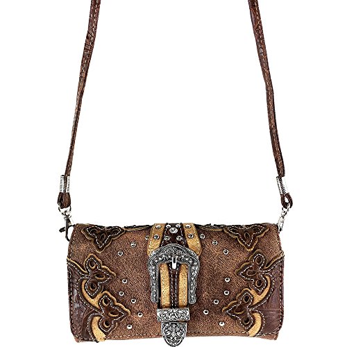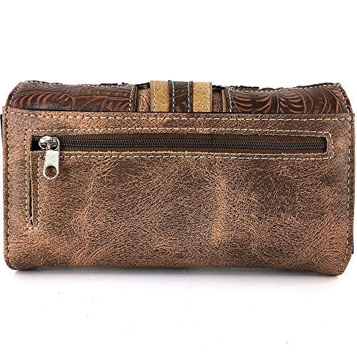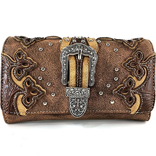 -. Feature : Beautiful Western Tooled Laser Cut Design / Rhinestone Silver Buckle Studded Wallet - Proudly Designed in the United States / Convenient Wristlet Handling and Long Shoulder Strap / Multiple Interior Size Pockets and Storage / Expandable Exterior Coin Pouch With Zipper Closure