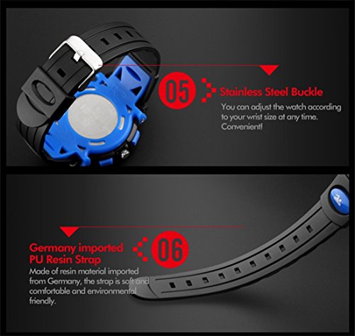 -. Feature : SPORT WATCH: Multifunctional Kids Waterproof Watch; with Fashion Appearance; Designed for Boys and Girls; / MULTIPLE FUNCTIONS: Equipped with time and date mode, alarm mode, stopwatch mode, Double Time Setting, and glow-in-the-dark function. Perfect for Sports and Daily Wear. / WATRE RESISTANT To 164 Feet: Support wear to swim and bathe. Please DONOT press any buttons underwater, and in case of damaging waterproof ring, please keep it away from steam and hot water. / COMFORT&Shock Resistant: Soft PU Rubber watch band bring comfortable wearing experience.Hard and Durable PC Material Shell; Stainless Steel Watch Band Buckle.With Retail Package, Good Gift for Children Birthday and Festival. / EXQUISITE DETAILS: Japanese Quartz Movement provide precise and accurate time keeping.