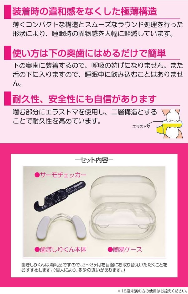 | 睡眠中の歯ぎしりは歯を痛めるだけでなく、身体に様々な悪い影響を与えることも。「歯ぎしりくん(R)」は下の奥歯にはめるだけ!歯ぎしりや噛み締めからあなたの大切な歯を守ります。自分の歯型に成形するのでフィット感もよく、装着時の違和感も大幅に軽減されています。 |