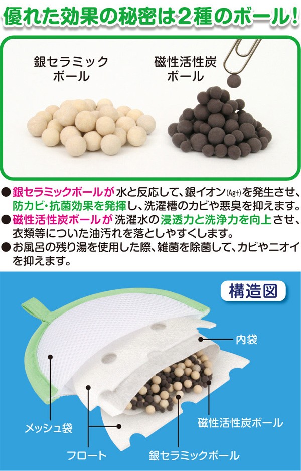 銀セラミックボールが水と反応して、銀イオン(Ag+)を発生させ、防カビ・抗菌効果を発揮し、洗濯槽のカビや悪臭を抑えます。さらに磁性活性炭ボールが洗濯水の浸透力と洗浄力を向上させ、衣類等についた油汚れを落としやすくします。