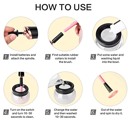 - Easy to Use : Just three quick steps to clean makeup brushes. 1. Put the dirty brush inside a properly sized silicone sleeve; 2. Pour into a little washing liquid and put the brush in the jar; 3. Turn on the switch and turn 10-30 seconds to clean as new.