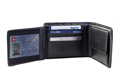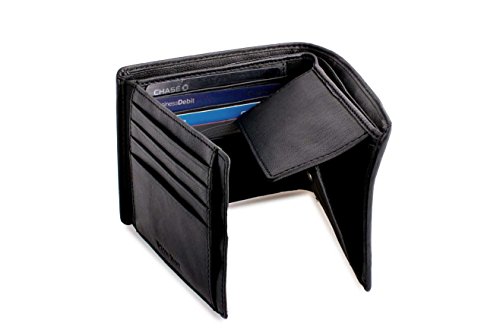 Classic, black, genuine lamb leather bifold flip wallet with coin compartment and RFID blocking technology to protect your personal information like your driver's license and credit cards. With convenient flip-out mesh photo ID section.