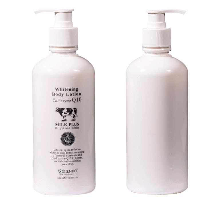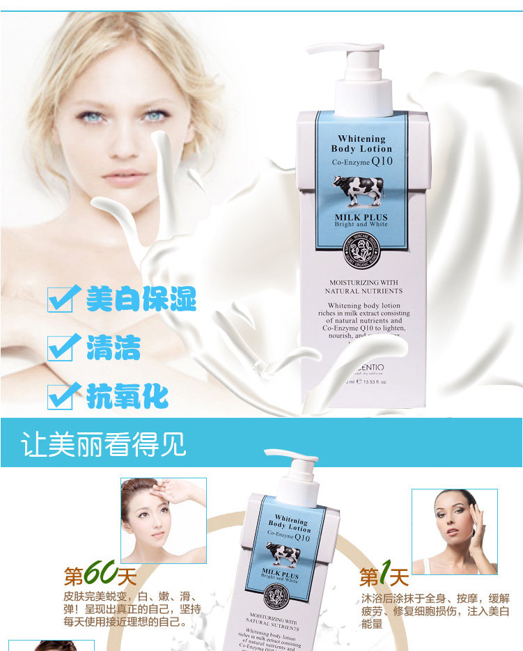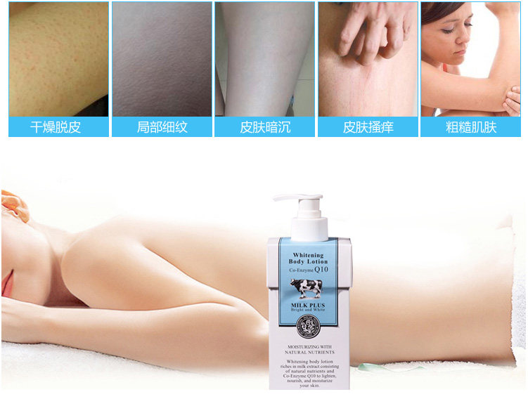 Whitening body lotion is full of readily absorbed bioactive milk protein extract and Co-Enzyme Q10, a naturally-occurring skin revitalizer. White milk protein extract conditions and lightens your skin tone, the key component, Co-Enzyme Q10, helps defend against skin aging, provides energy, and protects skin cells from damage caused by environmental factors such as exposure to sunlight. Co-Enzyme Q10 prevents the free radical that is 50 times more powerful than vitamin E. After a short time of use, skin becomes brighter, more even, softer, and more refined.