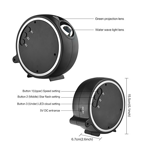 9 Modes Controlled By 3 Buttons - Green Flash Stars Light, Blue Led Nebular Light, Mixed Mode with Different Speed, Choose Light Projection Depend On Your Mood. Projector Lights Controlled By 3 Buttons - B1: Speed Setting, SLOW/STATIC/FasT. B2:Green Flash Stars Lights Setting B3: Blue Led Cloud Setting