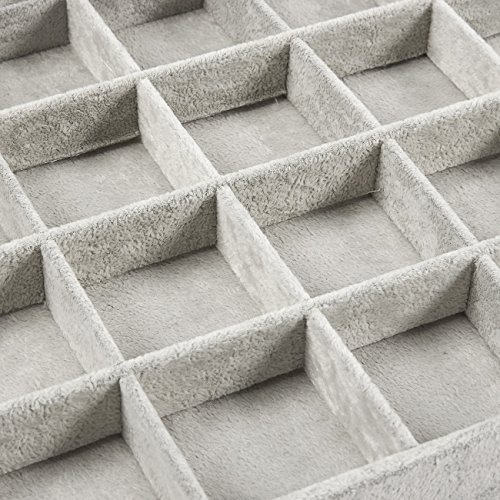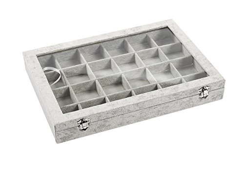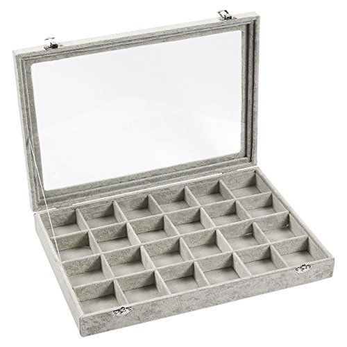 Jewelry Box – Stackable Display Case, Jewelry Holder, Storage Box for Necklaces, Pendants, Bracelets with Transparent Glass Top, 24 Compartments, Grey - 14 x 2 x 9.5 Inches