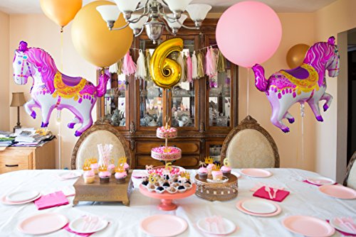 -. Feature : •shaped like a real horse - these circus balloons are 35" in size and shaped like real carnival ponies, complete with four legs, saddle, mane, tail, bridal and plume! / •great for parties - a charming galore decorative balloons can be used for a wide range of events, including birthday parties, holidays, surP.R.Ise events, and more. / •bright, vibrant colors - each colorful merry-go-round style balloon features a shiny finish and engaging colors and patterns, including pink, purple, gold and teal. / •thick, durable foil - crafted with a heavy-duty foil that's stronger and more puncture proof than rubber, our balloons are great for all ages. / •long-lasting lifespan - when filled with helium, our cute kid's balloons can float for weeks and even be refilled with proper care!