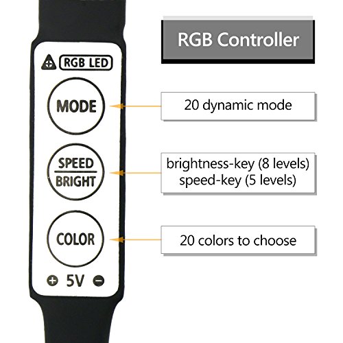★Small controller lets you choose from colors, brightness, modes and speed; 20 color selection with 8 brightness levels, 20 different patterns with 5 speeds