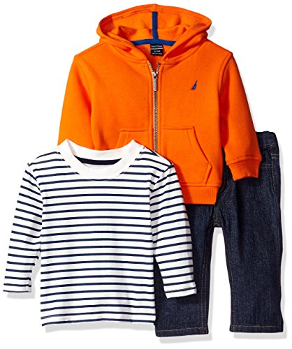 Nautica three piece fleece set which includes a full zip up hoodie, long sleeve tee and denim pant.
